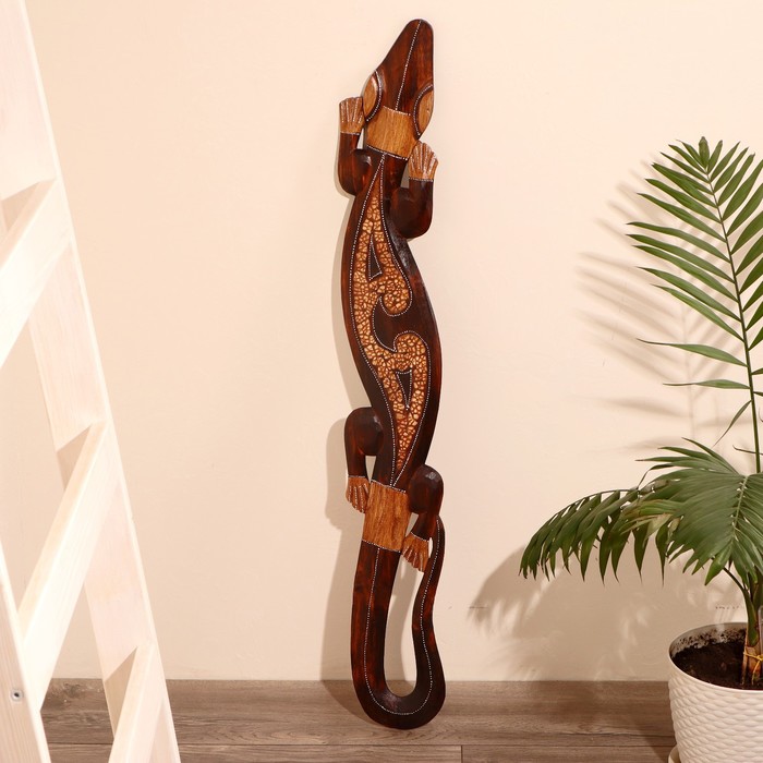 Не каждый осмелится разместить такое панно ручной работы в своем интерьере. Ведь порой кажется, что это настоящая живая рептилия. Искусные индонезийские мастера изобразили всё настолько детализировано четко, что хочется прикоснуться к панно дерево "Геккон" 100х14х1 см и ощутить тонкие линии изгибов этой «ящерицы счастья».