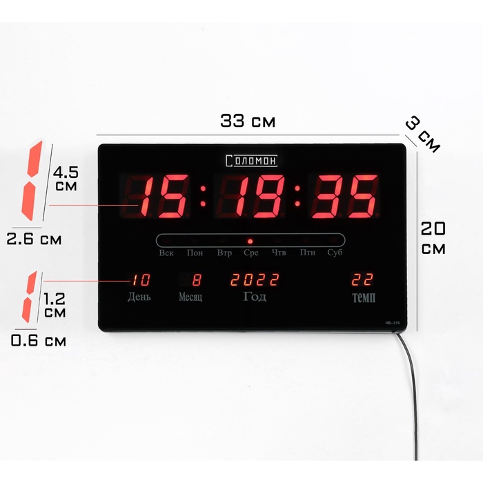 УЦЕНКА Часы электронные настенные, будильник, календарь, термометр, 20 х 3 х 33 см, красные 1093078 10930784 Соломон