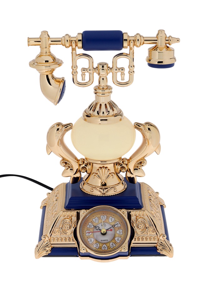 Кварцевый механизм обеспечивает точный ход, а мягкая подсветка превращает устройство в приятный ночник. Такое сочетание декоративности и функциональности делает светильник-телефон отличным решением для спальни, кабинета или детской.