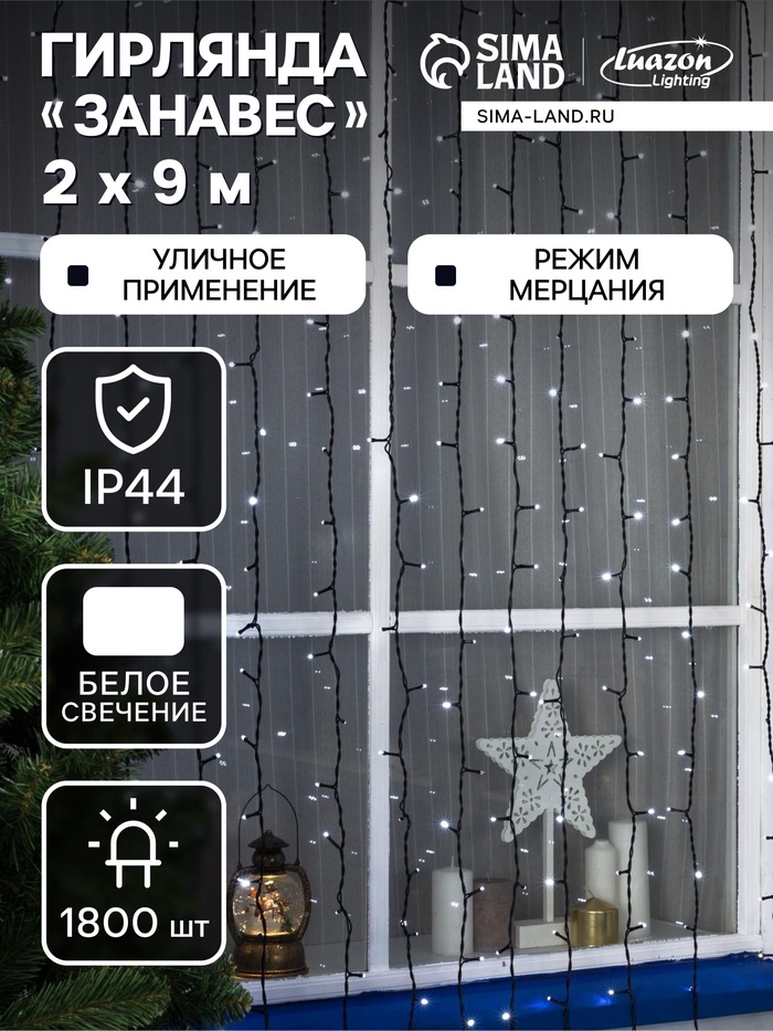 УЦЕНКА Гирлянда «Занавес» 2 × 9 м, IP44, УМС, тёмная нить, 1800 LED, свечение белое, мерцание, 220 В 10393946 Luazon Lighting