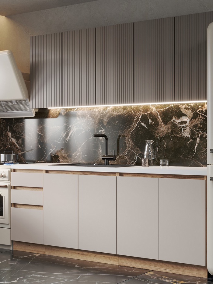 Кухня со столешницей в оттенках коричневый софт и бежевый софт — гарнитур, который производит неизгладимое впечатление на тех, кто ценит красоту и современный стиль в кухнях. Актуальный дизайн, вместительность и удобство не оставит равнодушным никого.