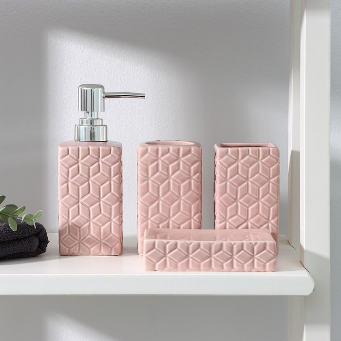 УЦЕНКА Набор аксессуаров для ванной комнаты Доляна «Звёзды», 4 предмета (дозатор 300 мл, мыльница, 2 стакана), цвет розовый 10401255 Доляна