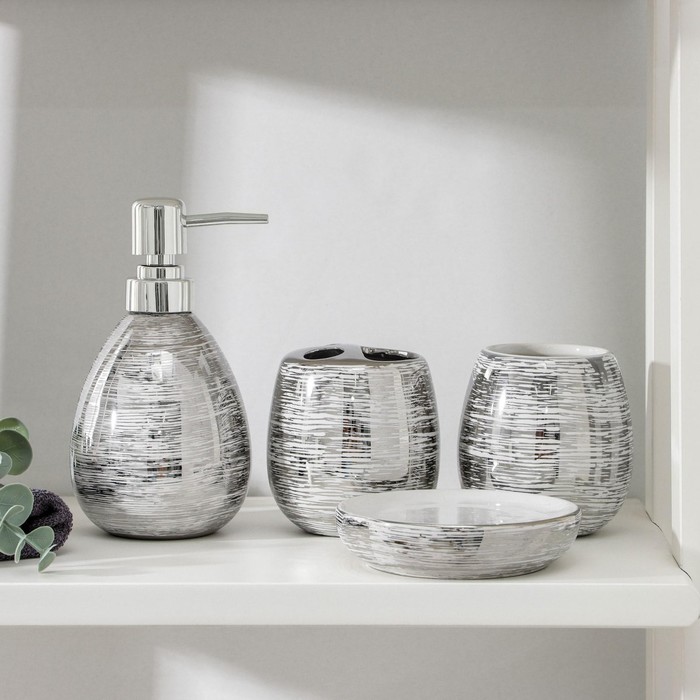 УЦЕНКА Набор аксессуаров для ванной комнаты «Нити», 4 предмета (мыльница, дозатор 400 мл, 2 стакана), цвет серебряный 10189507