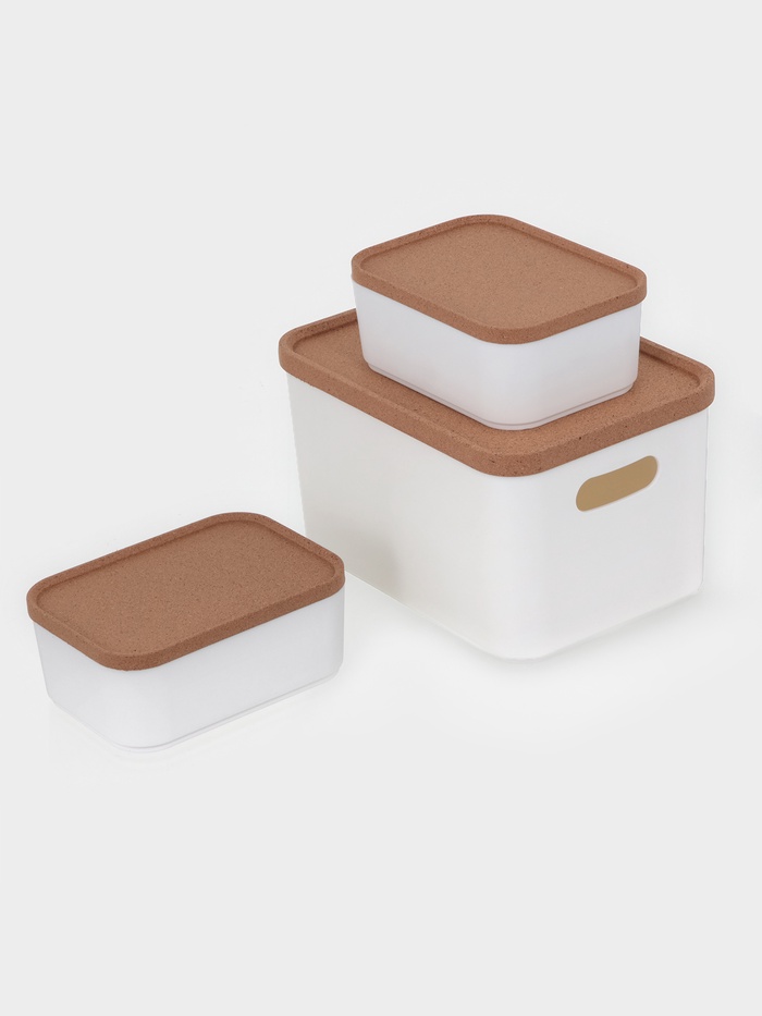 Набор состоит из 3 органайзеров с крышками: одного большого, объёмом 2,4 л, и двух маленьких, объёмом 0,76 л. Крышки сделаны из экологически чистого, безопасного и возобновляемого материала — коры пробкового дерева. Её срезают, когда дерево достигает 25-летнего возраста. Процесс повторятся каждые 9–10 лет, что помогает восстановить слой коры и не вредит деревьям.
