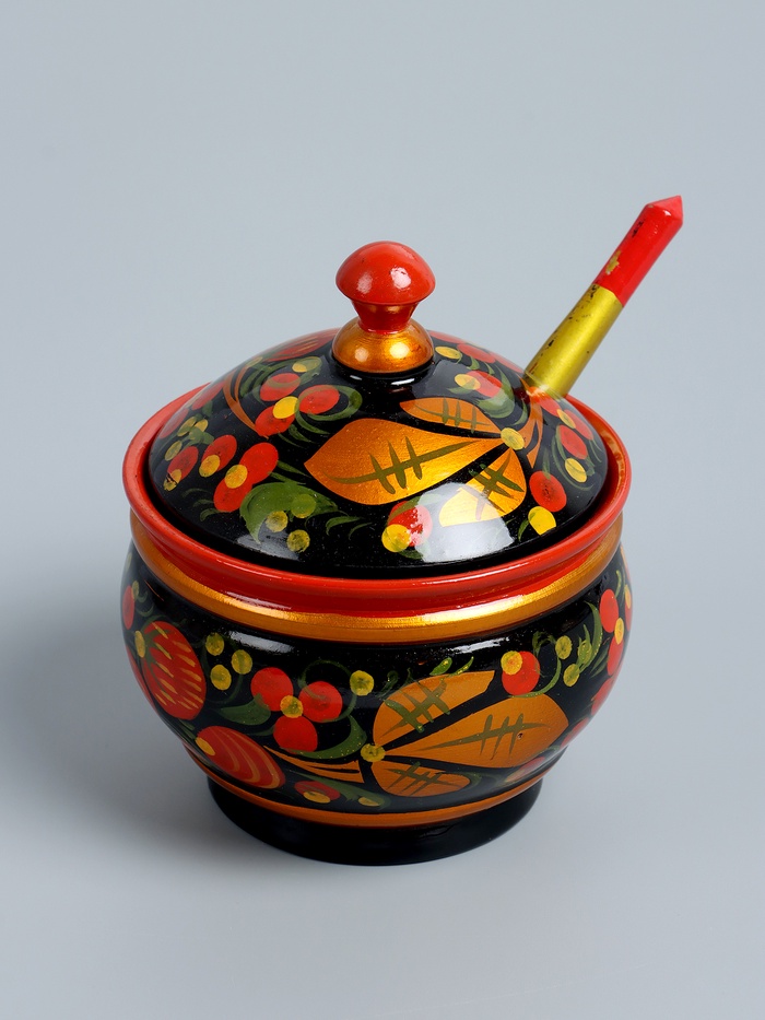 Каждая деталь этой сахарницы пронизана мастерством и любовью к народному искусству. Разноцветный орнамент с изображением спелых ягод на чёрном фоне создаёт атмосферу летнего сада и дарит чувство праздника. Овальная форма и натуральное дерево подчёркивают экологичность и долговечность изделия, а ручная работа придаёт ему особую ценность.